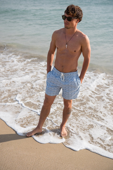 Men's swim trunks with a fixed waist and drawstring adjustment. Made from 100% recycled polyester for easy drying, following the fundamental principle of respect for the environment.