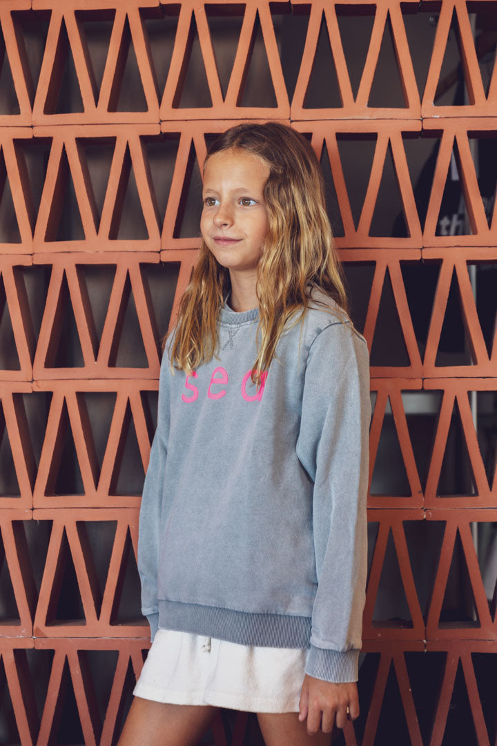 Light grey washed sweatshirt with fluorescent pink SEA print.