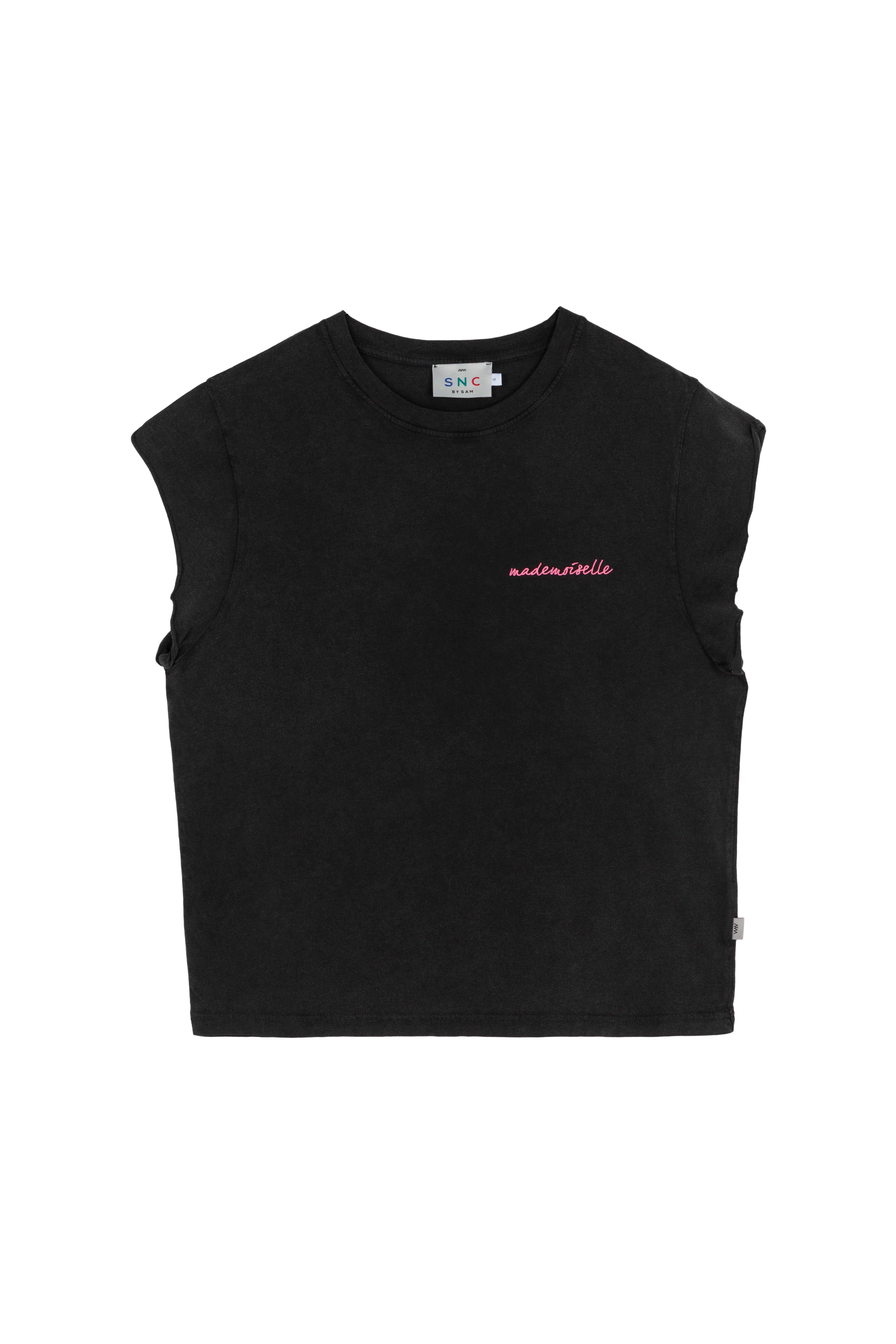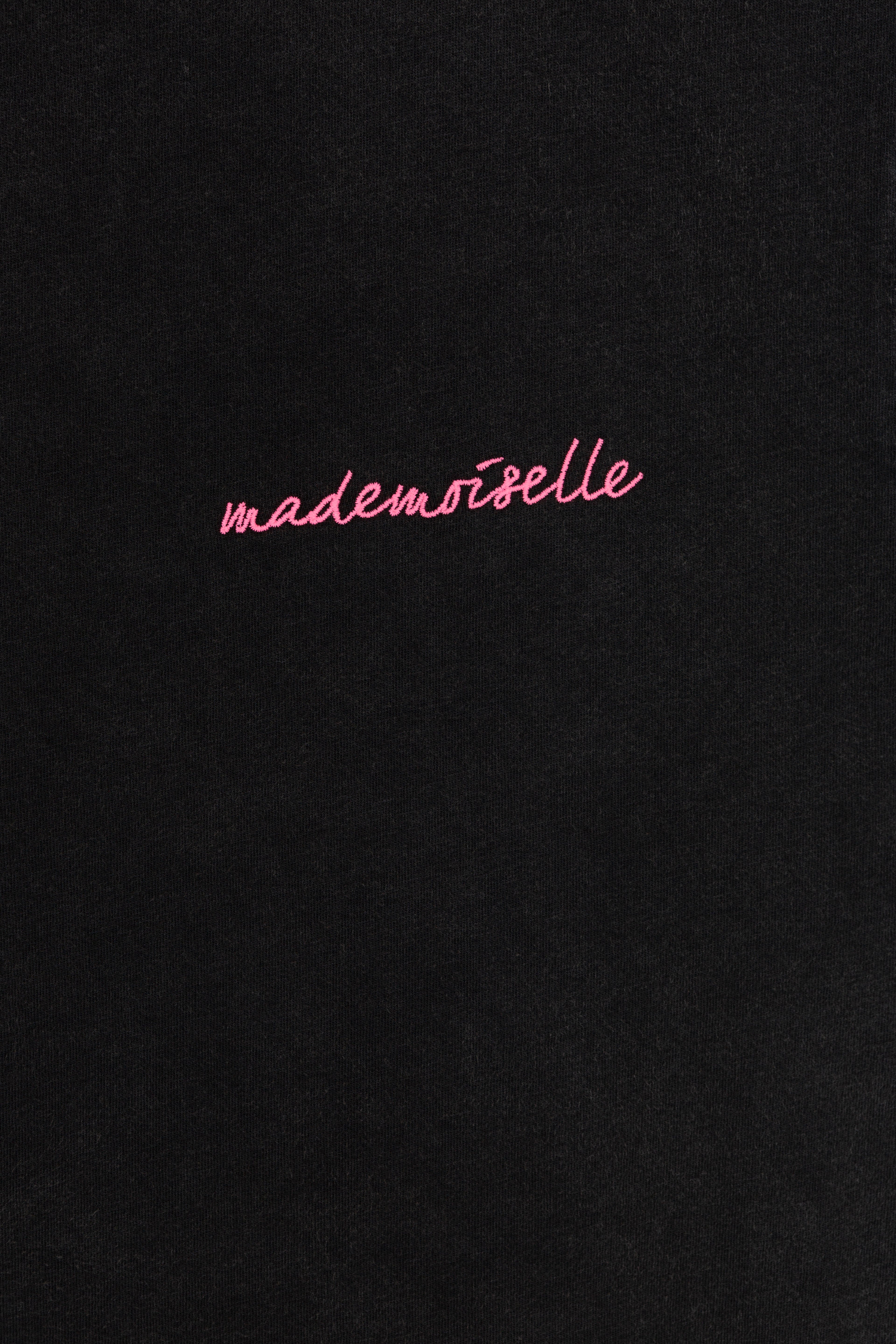 Este top, hecho en Portugal con 100% algodón de alta calidad, es suave y transpirable, perfecto para climas cálidos. El bordado "Mademoiselle" en el pecho añade un toque chic y distintivo.