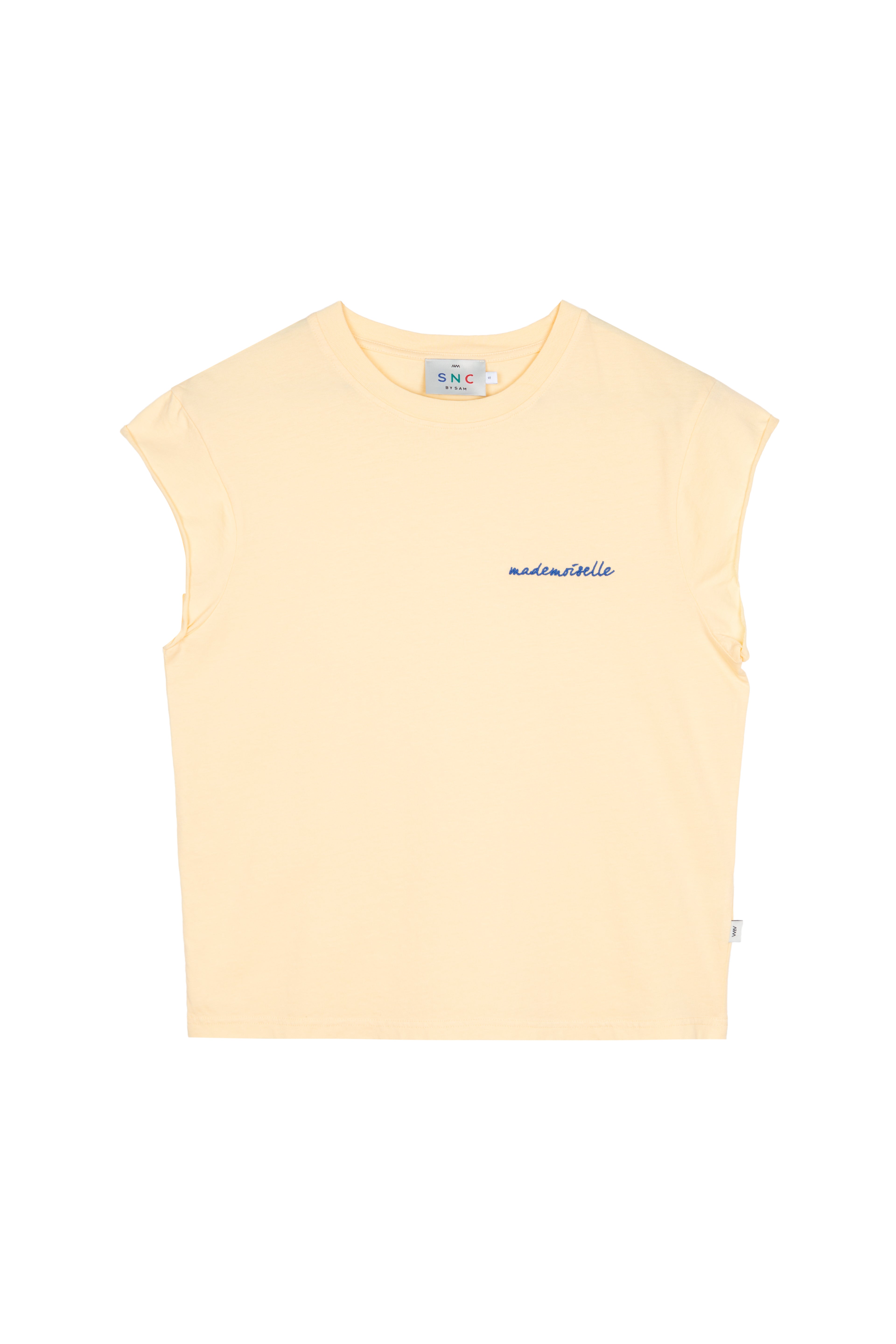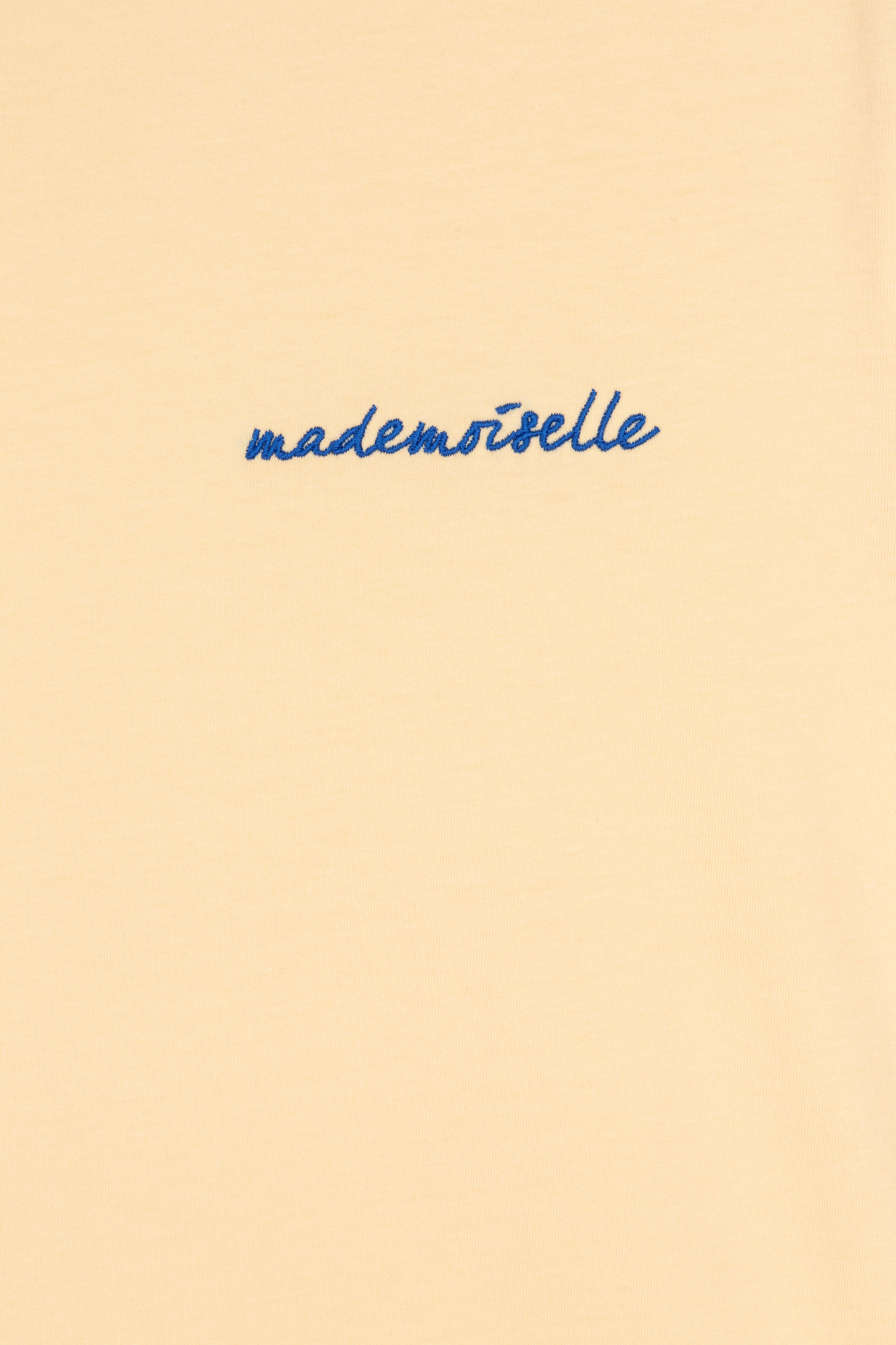 Este top, hecho en Portugal con 100% algodón de alta calidad, es suave y transpirable, perfecto para climas cálidos. El bordado "Mademoiselle" en el pecho añade un toque chic y distintivo.