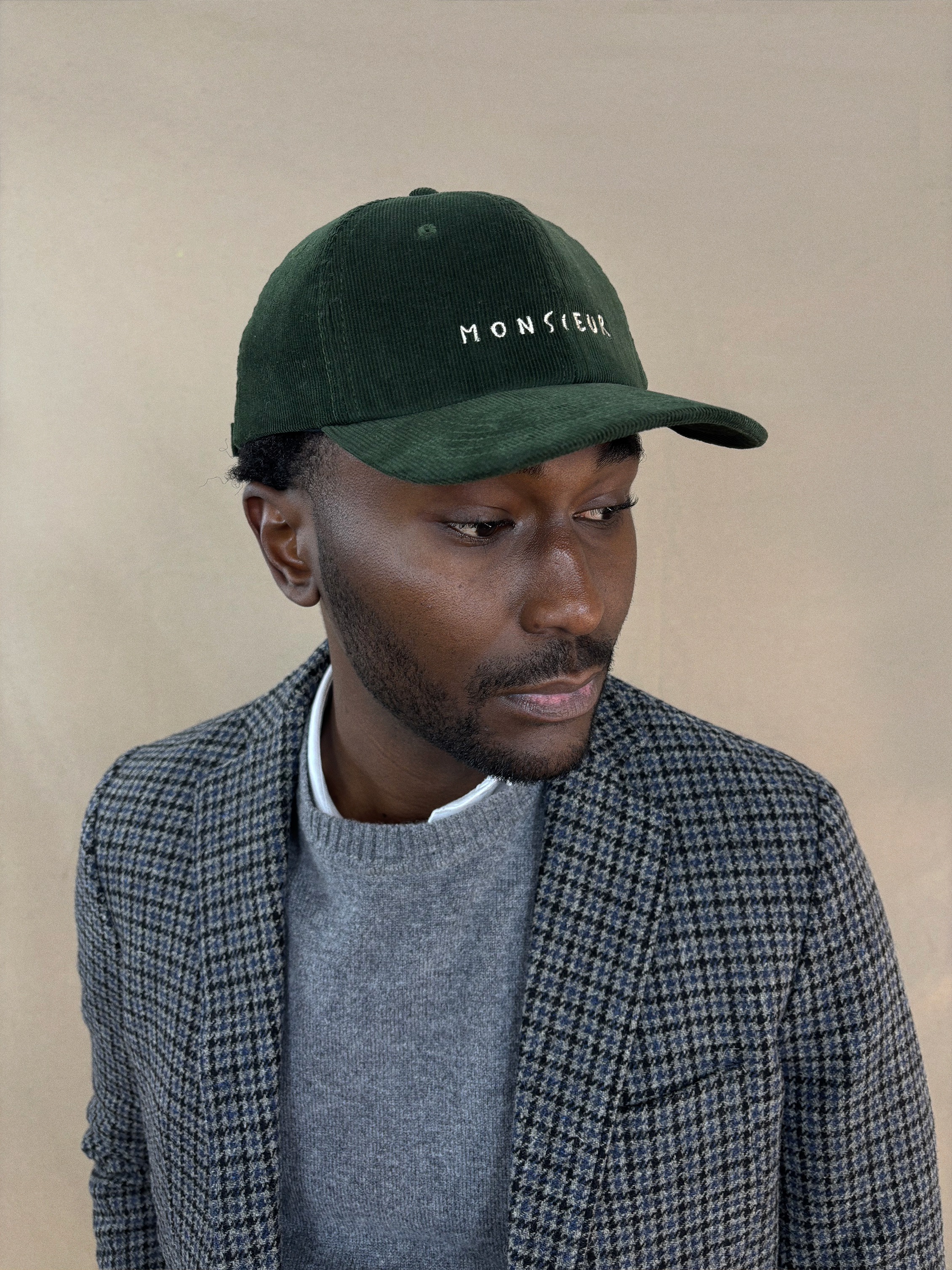 Gorra de pana de estilo clásico con un toque contemporáneo. Confeccionada en suave pana de alta calidad, ofrece una textura cálida y resistente, ideal para el uso diario. En el frontal destaca el bordado “Monsieur”, realizado con precisión y carácter, aportando una estética elegante y desenfadada a la vez.
