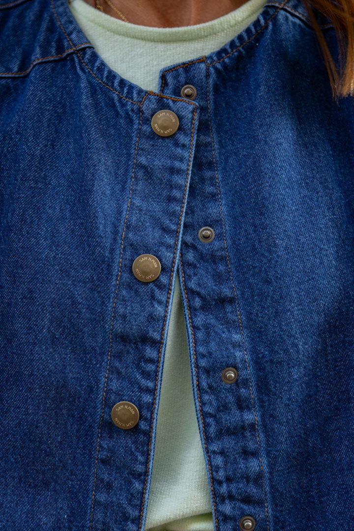 Chaleco de mujer en denim, diseñado para un estilo moderno y versátil. Confeccionado en denim de alta calidad, ofrece un ajuste cómodo y favorecedor. Presenta botones frontales metálicos y un acabado lavado que aporta un toque casual y actual. Perfecto para combinar con blusas o camisetas, ideal para looks urbanos y relajados.