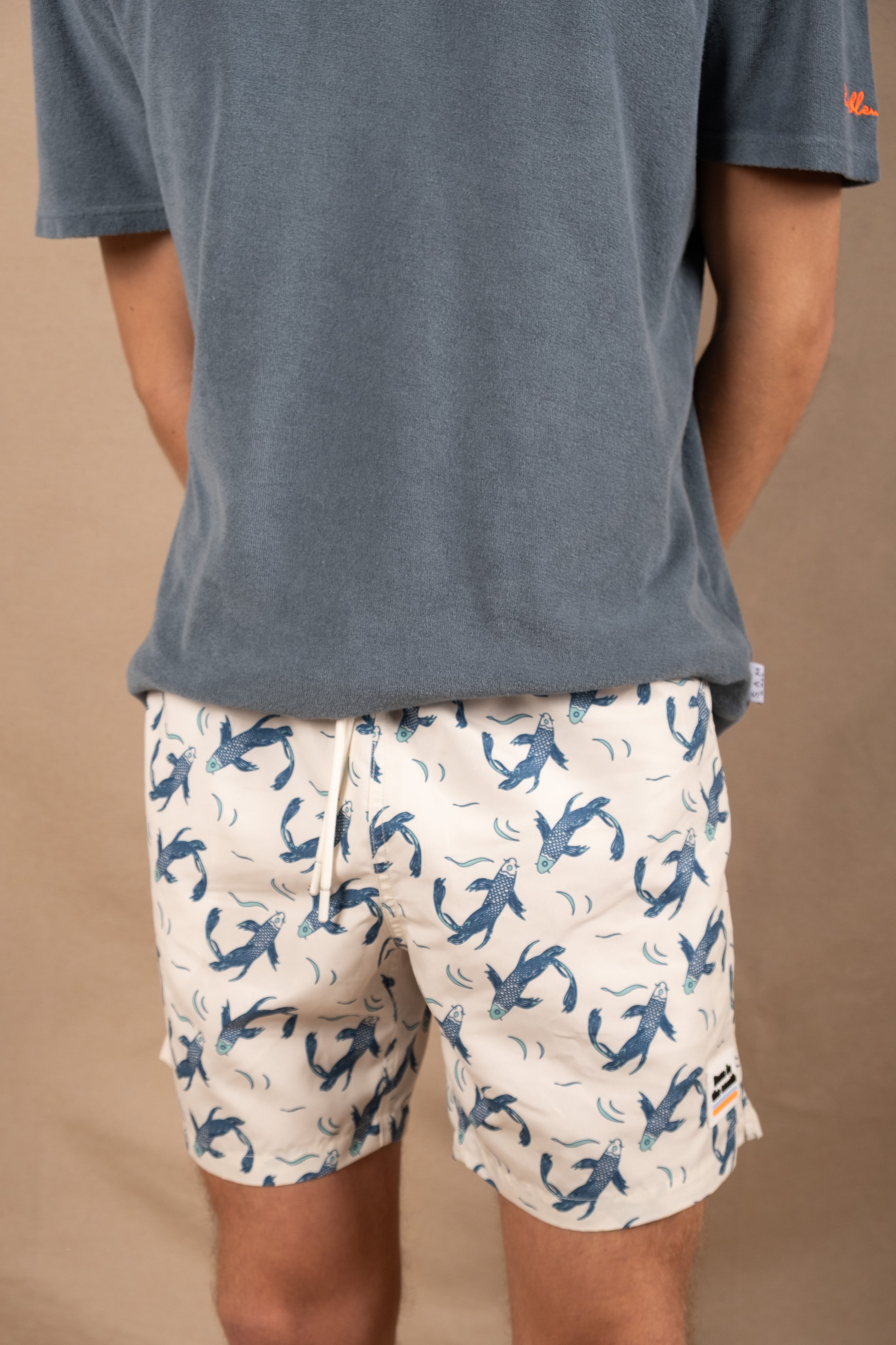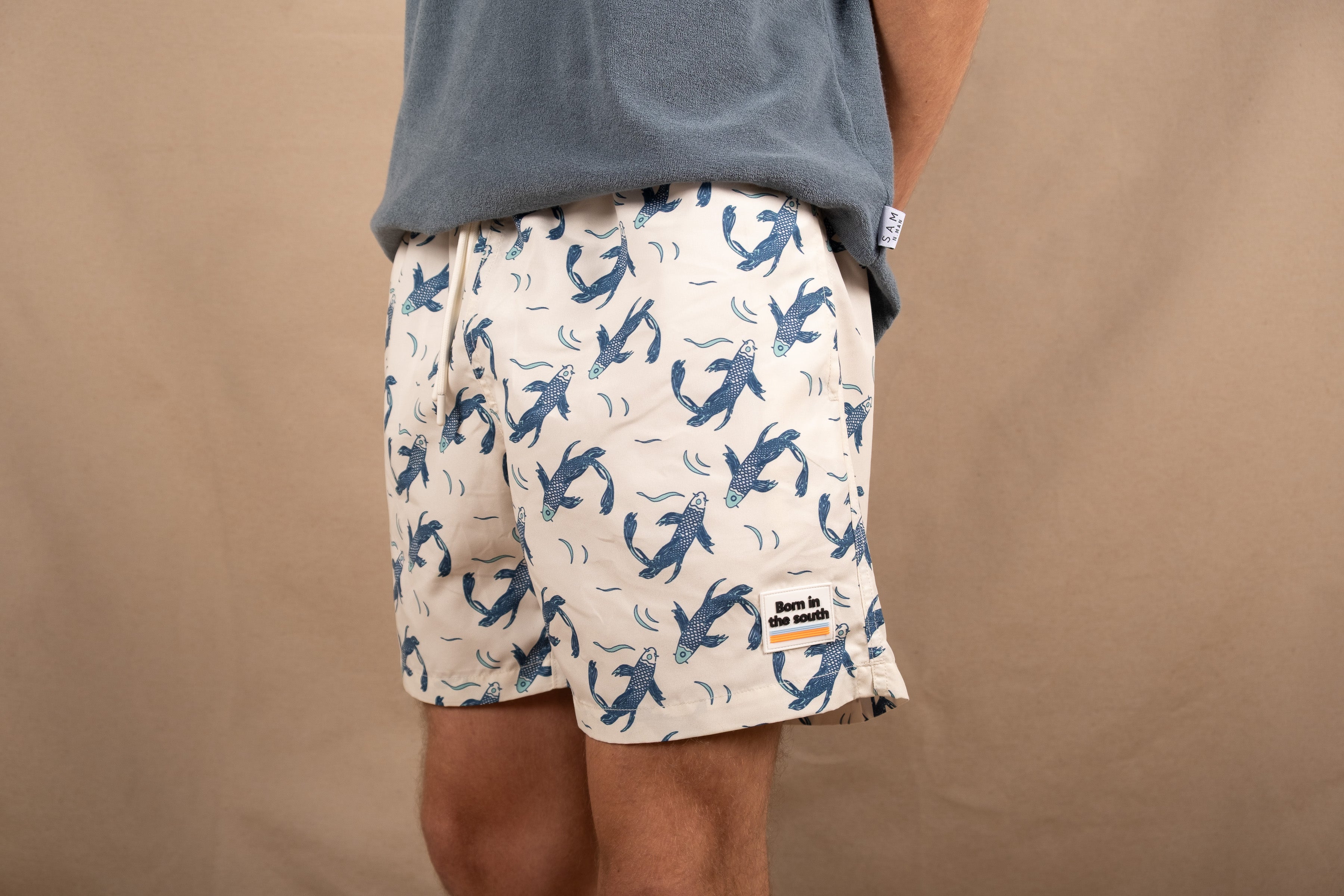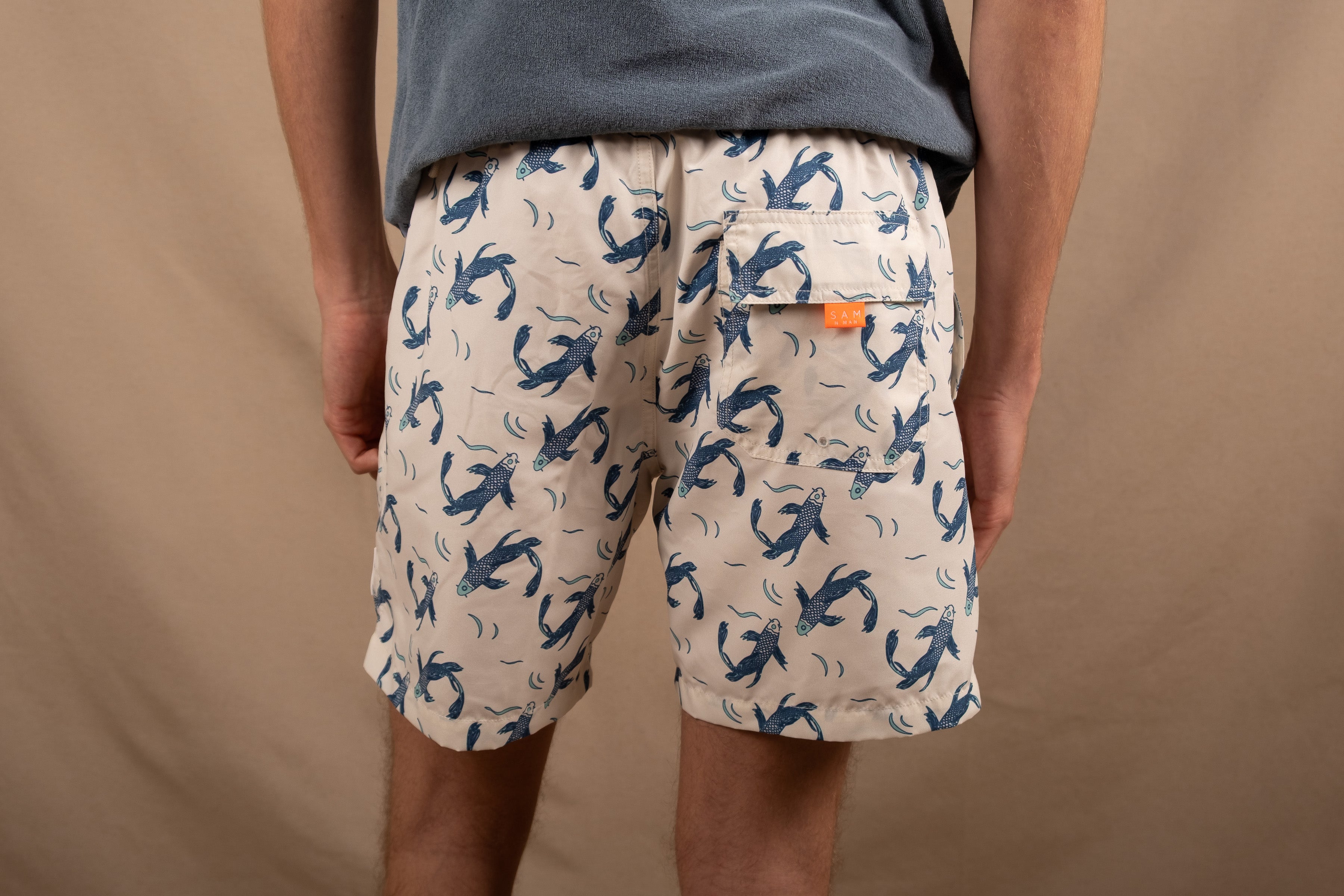 Traje de baño para hombre con cintura fija y ajuste con cordón. Tejido confeccionado 100% en poliéster reciclado para facilitar su secado siguiendo el principio fundamental al respeto por el medio ambiente.