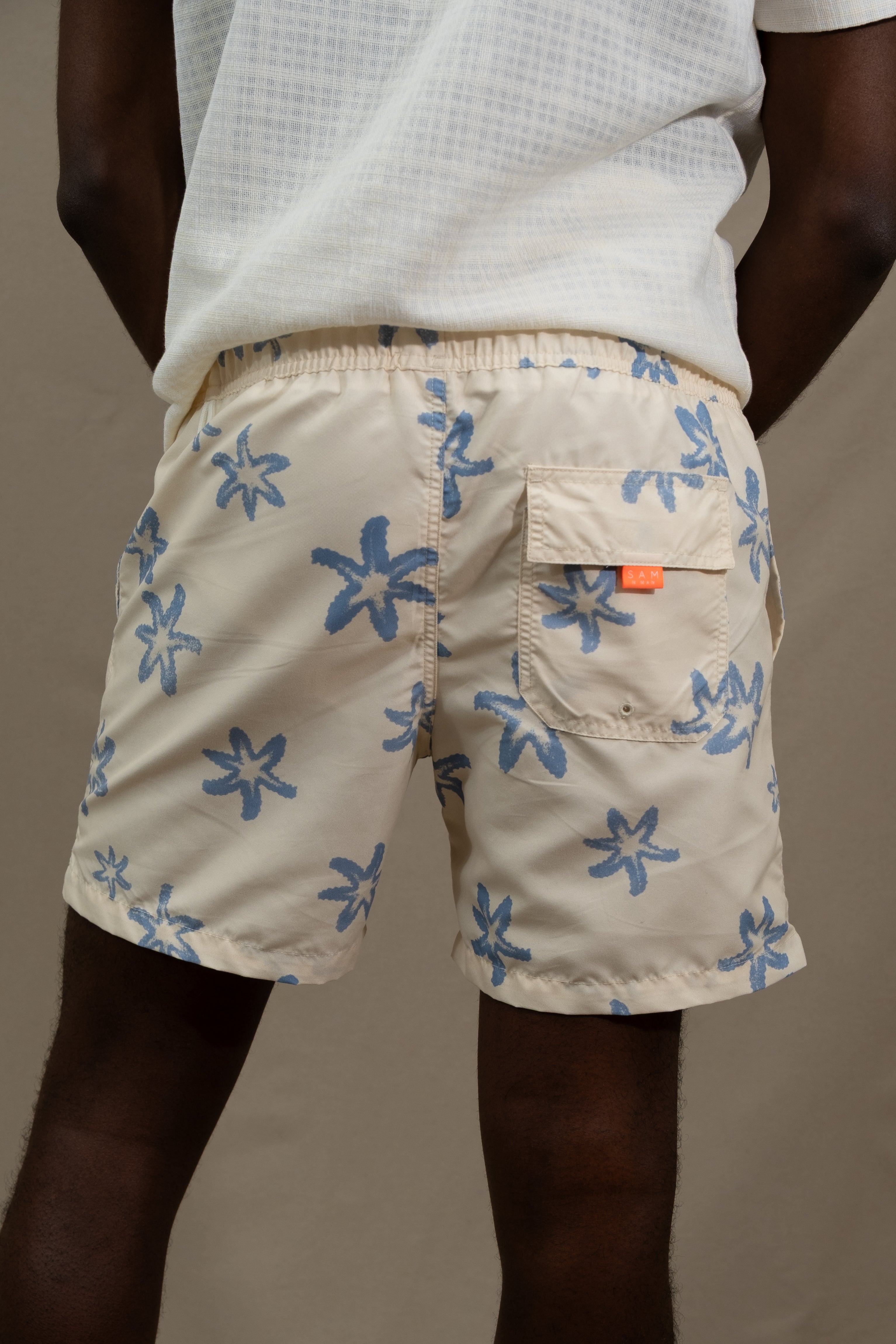Traje de baño para hombre con cintura fija y ajuste con cordón. Tejido confeccionado 100% en poliéster reciclado para facilitar su secado siguiendo el principio fundamental al respeto por el medio ambiente.