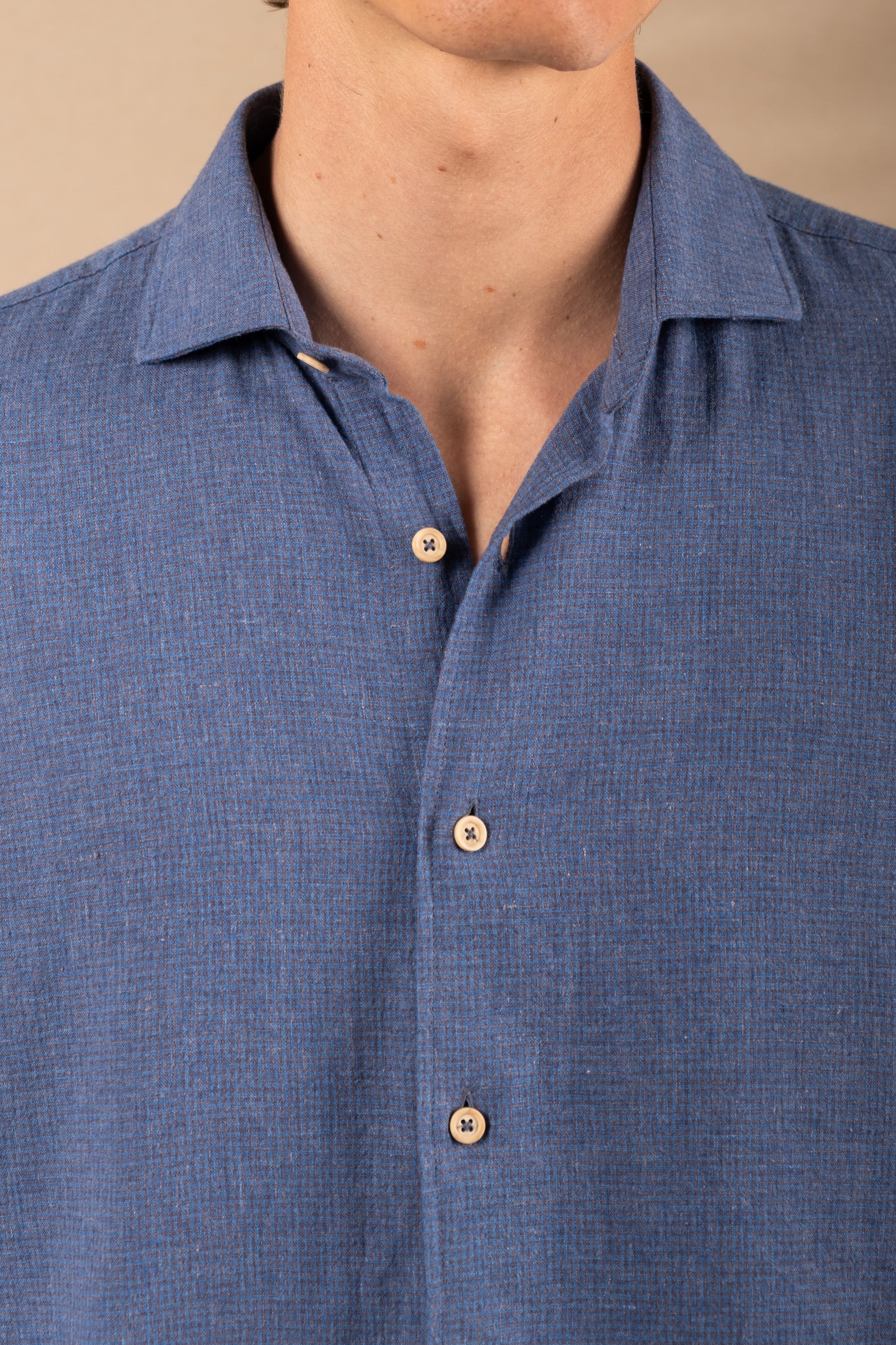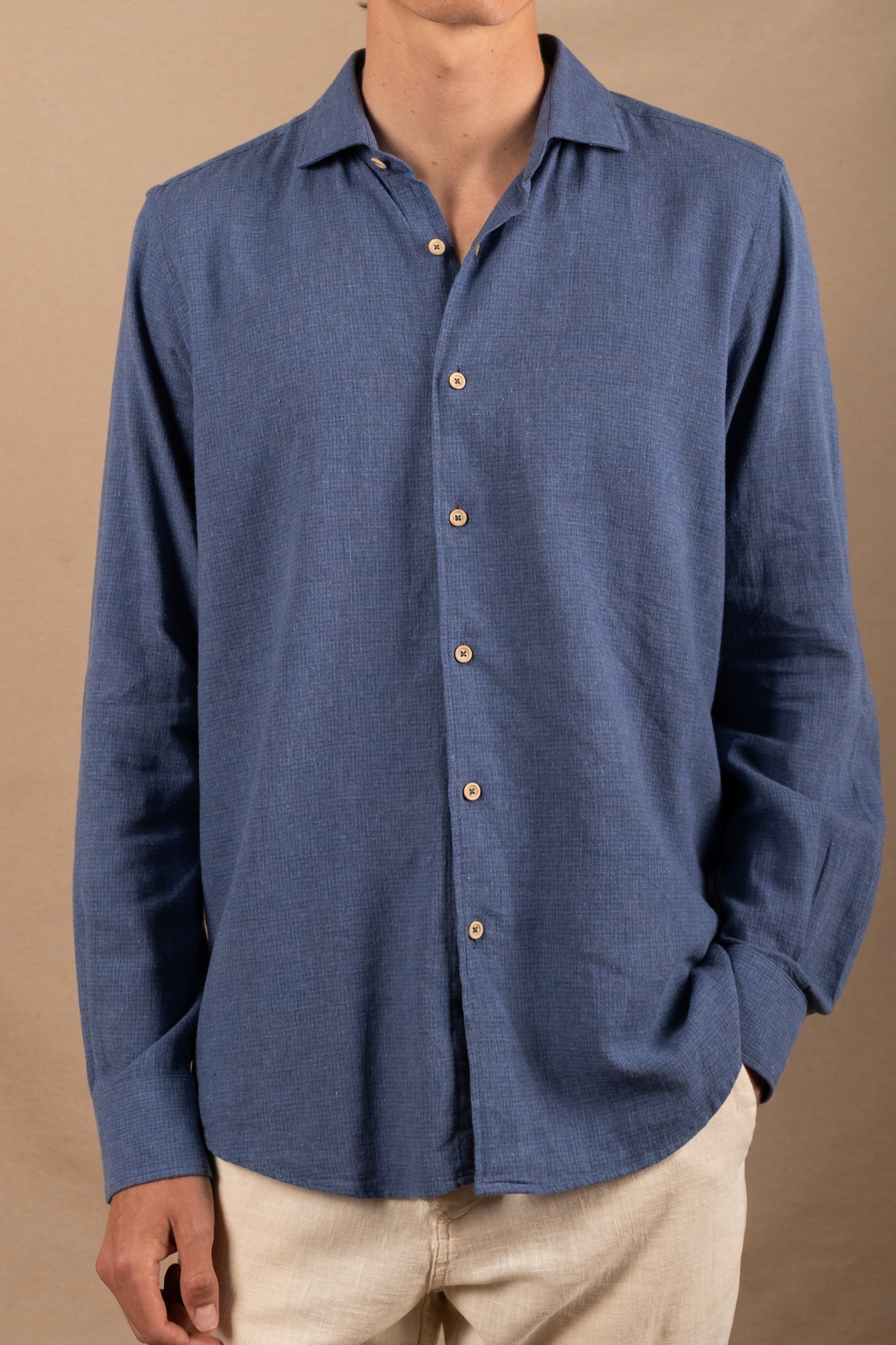Camisa de cuello sport con botones de madera, confeccionada en España con una mezcla de 55% lino y 45% algodón. Fresca, ligera y con un estilo natural, destaca por su diseño relajado y detalles artesanales que aportan carácter y autenticidad. Ideal para un look casual con personalidad.