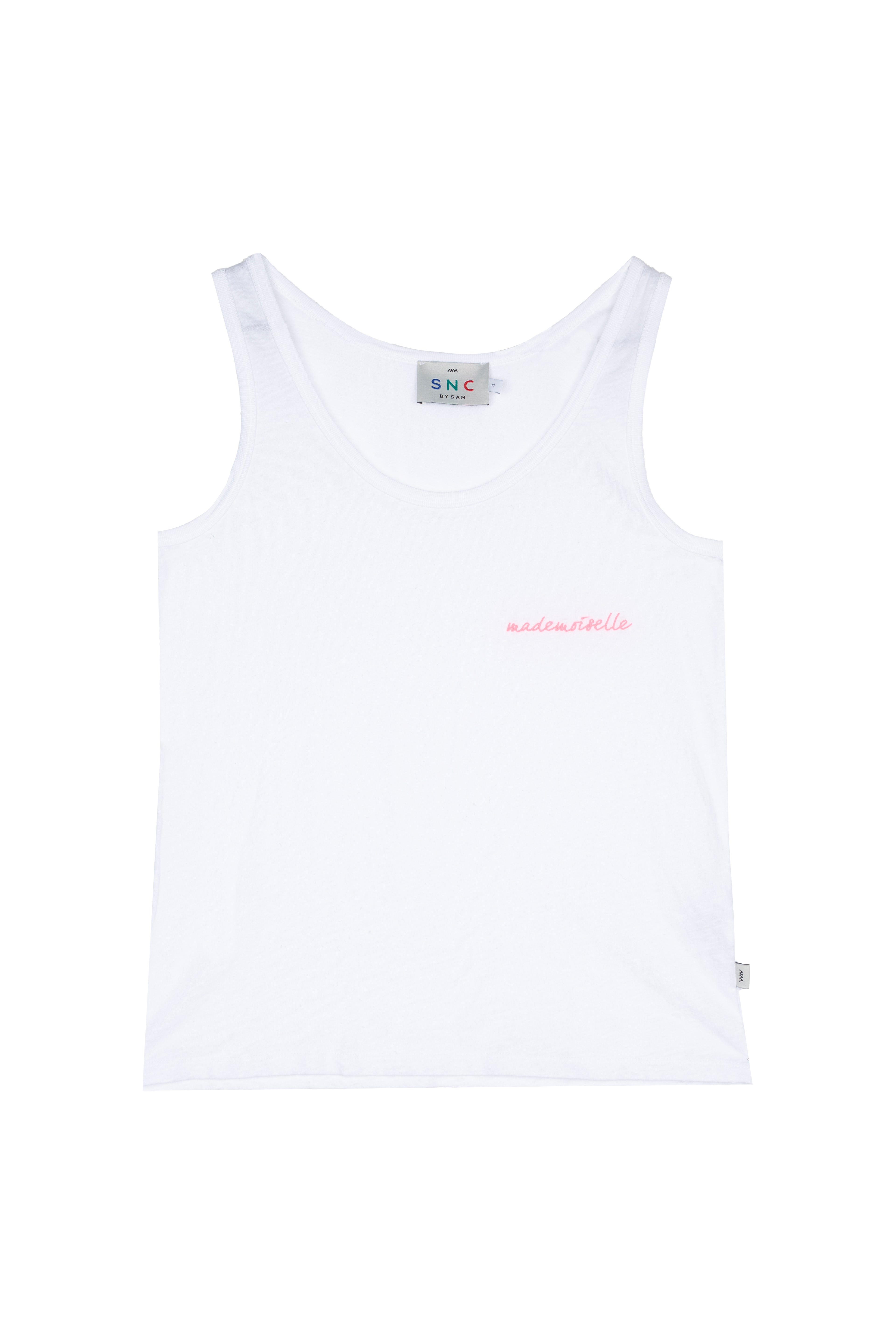 Presentamos nuestra camiseta top de mujer con bordado "Mademoiselle", inspirado en el verano del sur de España.