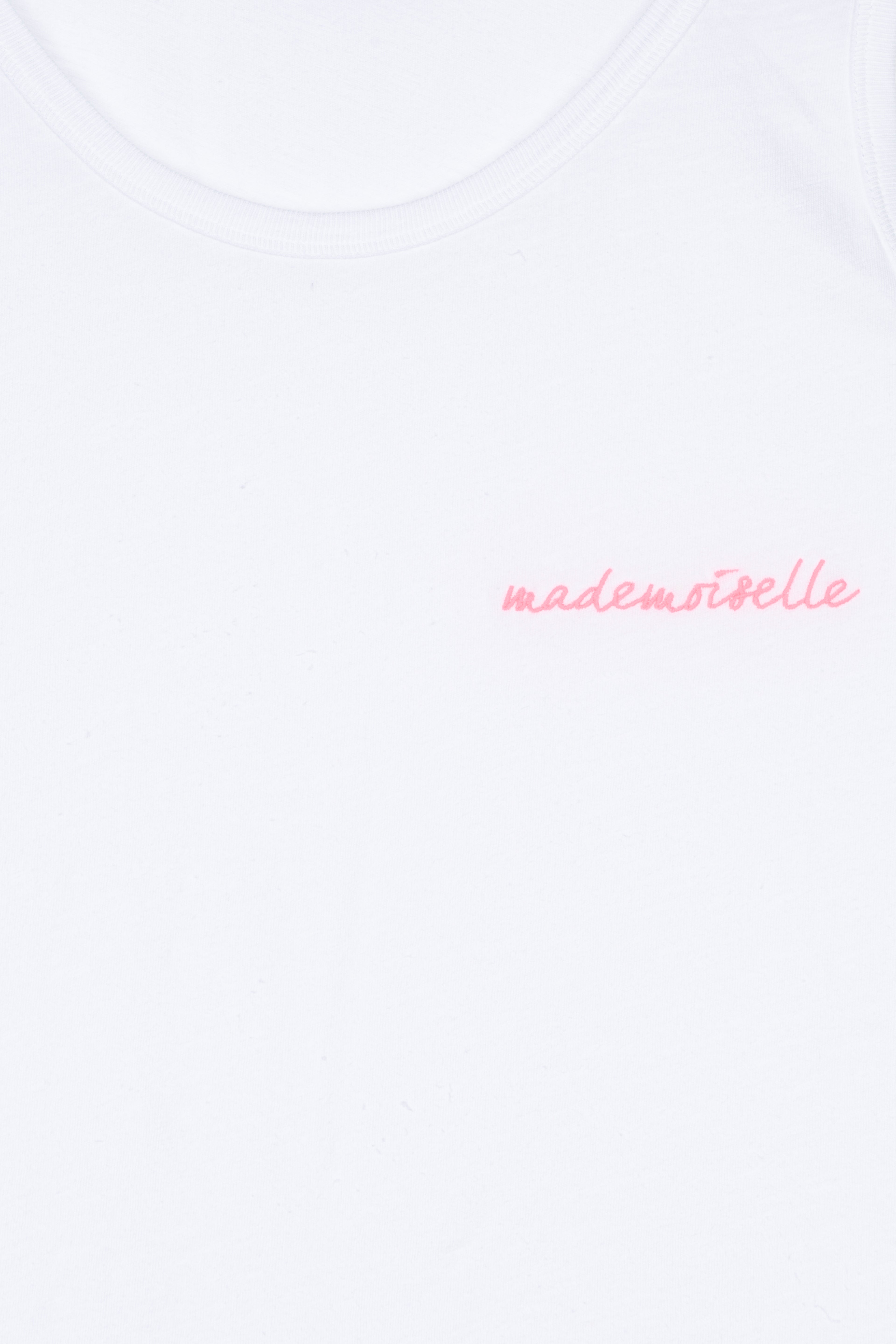 Este top, hecho en Portugal con 100% algodón de alta calidad, es suave y transpirable, perfecto para climas cálidos. El bordado "Mademoiselle" en el pecho añade un toque chic y distintivo.